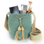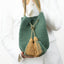 Ce modèle est la version moyenne du sac iconique. La base est de couleur Vert Vintage. La bandoulière est une bandoulière tissée bicolore Vert Vintage & Camel ainsi que le cordon. Les pompons sont bicolores Vert Vintage et Camel, surmonté d'un capuchon Camel.