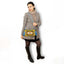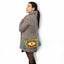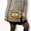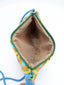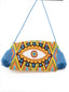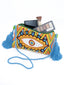 Pochette à Motifs brodée Rouge, Jaune, Vert, Orange et Bleu avec sangle Bleu et deux pompons Bleus