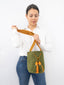 Ce modèle est la version moyenne du sac iconique. La base est de couleur Vert Militaire. La bandoulière est une bandoulière tissée bicolore Vert Militaire & Orange ainsi que le cordon. Les pompons sont bicolores Vert Militaire et Orange, surmonté d'un capuchon Orange.