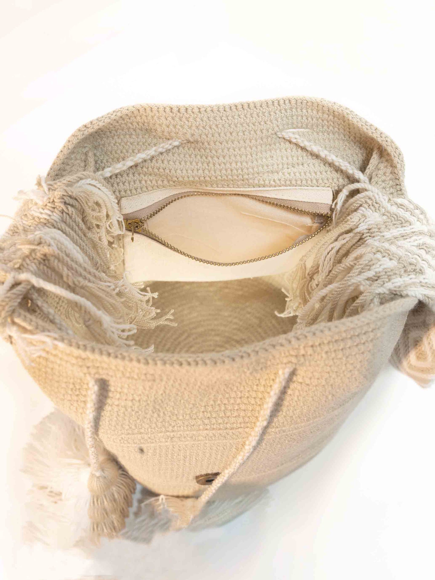 Une variante très chic et stylée du Mochilas Wayuu. Fait main selon les méthodes traditionnelles Wayuu. Ce sac cloche, se compose d'une base unicolore Beige, d'une bandoulière tissée avec des motifs beige et blanc et d'un cordon qui se termine par deux Pompons bicolores Beige et Blanc. Ce modèle possède un splendide rabat en design mandala, minutieusement orné de strass en rappel de chaque couleur du motif mandala.